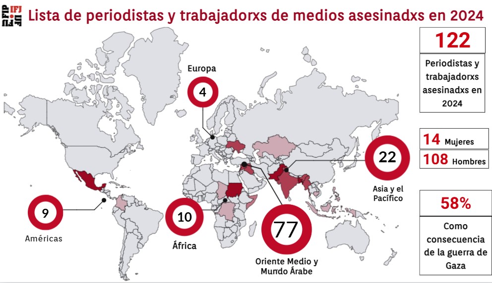 Στις 10 Δεκεμβρίου, Παγκόσμια Ημέρα Ανθρωπίνων Δικαιωμάτων, η ΔΟΔ δημοσίευσε μια αρχική καταγραφή των δολοφονιών δημοσιογράφων κατά το 2024, σημειώνοντας 104 περιστατικά. Η ενημερωμένη λίστα της 31ης Δεκεμβρίου περιλαμβάνει επιπλέον θανάτους στη Μέση Ανατολή και τον αραβικό κόσμο –εννέα ακόμη δημοσιογράφοι σκοτώθηκαν στην Παλαιστίνη και δύο στη Συρία– καθώς και άλλες δολοφονίες που τέθηκαν υπόψιν της Ομοσπονδίας.