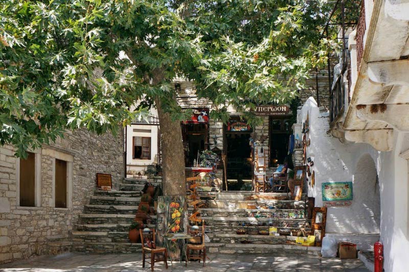 Esta villa con forma de anfiteatro también es el lugar ideal para sentarte en alguna de sus pintorescas tabernas a degustar la deliciosa gastronomía local. Prueba los quesos autóctonos como el Graviera o el Myzithra y el famoso Kitron (un licor de sabor intenso elaborado con citrón, un cítrico que crece en la isla).