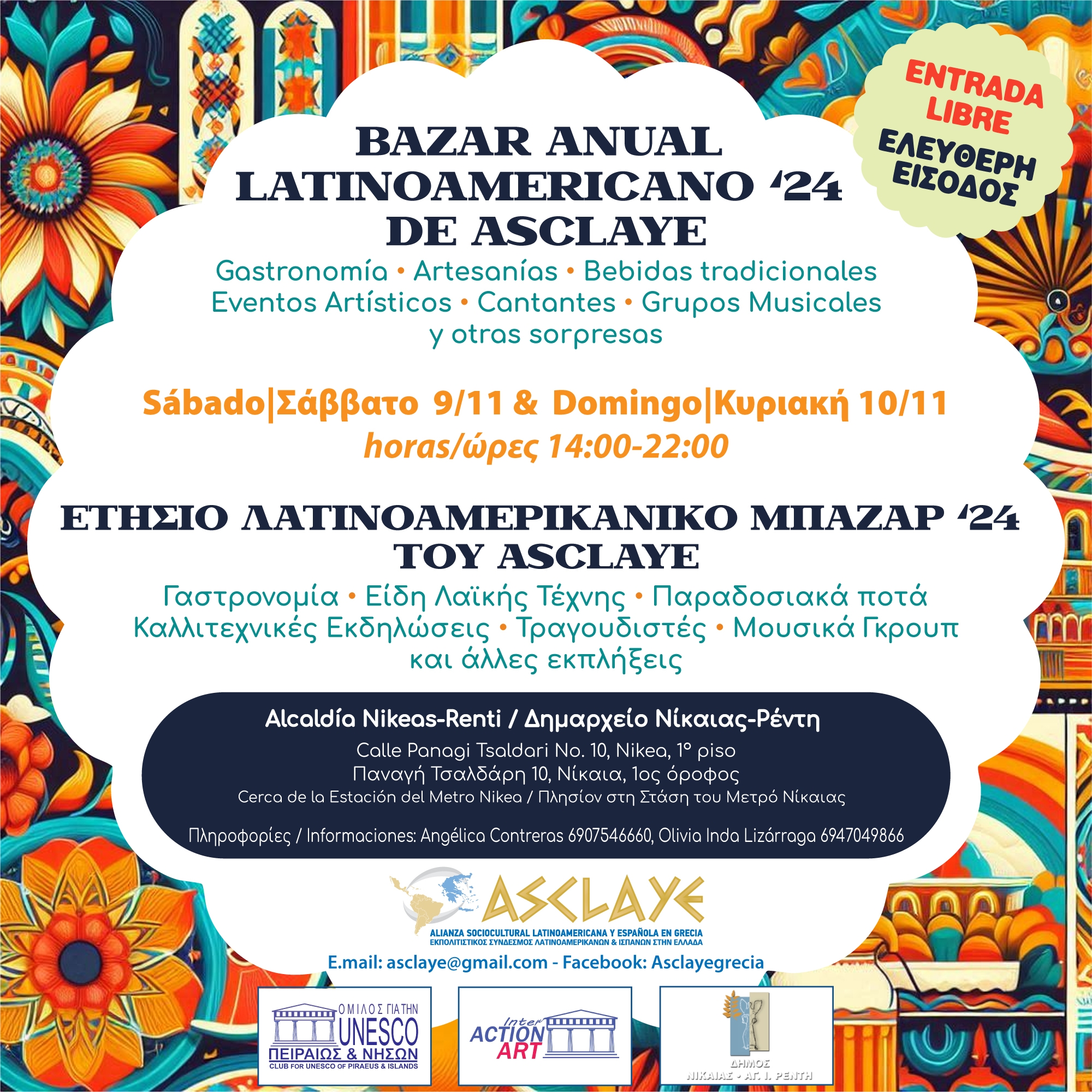 Λατινοαμερικάνικο bazar διοργανώνει εν όψει των Χριστουγέννων ο Σύλλογος Λατινοαμερικάνων Asclaye στην Αθήνα το Σαββατοκύριακο 9 και 10 Νοεμβρίου. Η εκδήλωση θα πραγματοποιηθεί στο δημαρχείο Νίκαιας – Ρέντη και θα περιλαμβάνει μουσική, παραδοσιακά εδέσματα και είδη λαϊκής τέχνης.