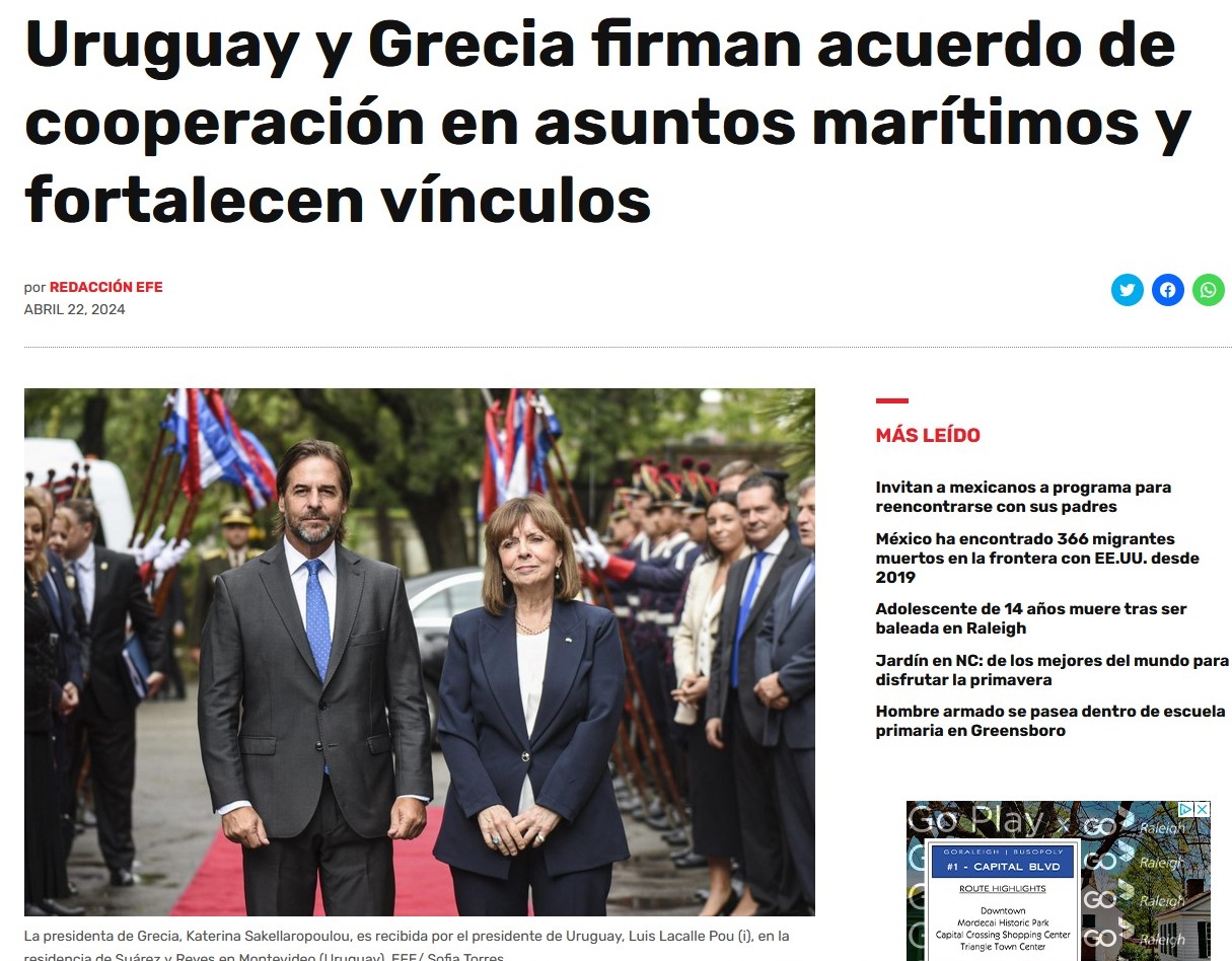 Newsroom. Με ιδιαίτερα θερμά λόγια αναφέρονται τα μέσα ενημέρωσης της Ουρουγουάη για την επίσημη επίσκεψη της Προέδρου της Δημοκρατίας κ. Κατερίνας Σακελλαροπούλου στη λατινοαμερικάνικη χώρα. Η κ. Σακελλαροπούλου έγινε δεκτή από τον πρόεδρο της χώρας κ. Luis Lacalle Pou και την αντιπρόεδρο κ. Beatriz Argimon. “Θαυμάζουμε την Ουρουγουάη. Θαυμάζουμε τον λαό της Ουρουγουάη” δήλωσε η κ. Σακελλαροπούλου, σύμφωνα με τα μέσα ενημέρωσης της χώρας. “Έχουμε δεσμούς που συνδέονται με τον πολιτισμό. Εδώ υπάρχει μια σημαντική ελληνική κοινότητα όπως επίσης επιχειρηματίες. Το συζητήσαμε με τον πρόεδρο που ενδιαφέρεται να εμβαθύνουμε τις σχέσεις ανάμεσα στις δυο χώρες”, πρόσθεσε.