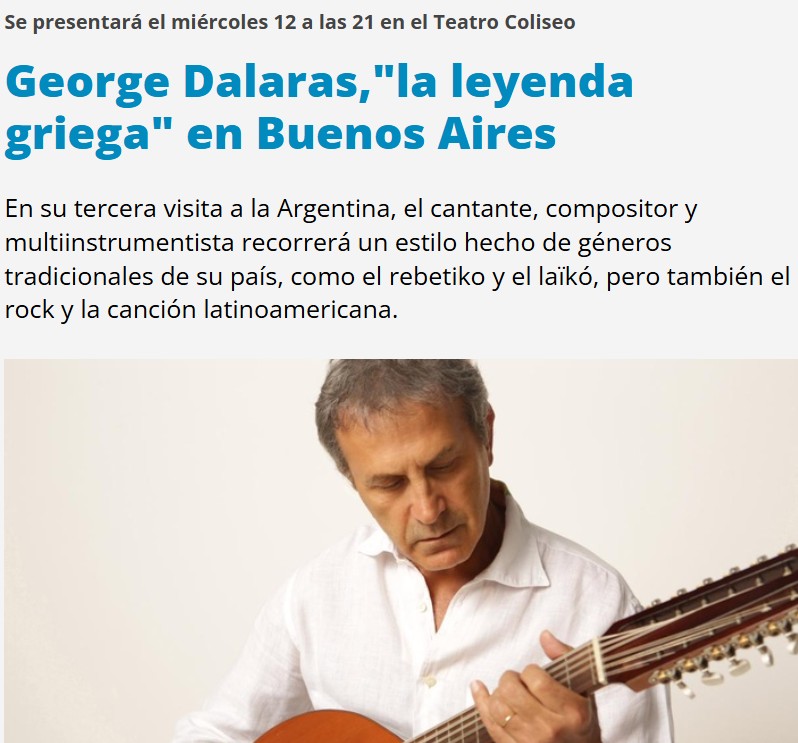 Η αργεντίνικη εφημερίδα Pagina 12 δημοσιεύει εκτενές αφιέρωμα στον Γιώργο Νταλάρα, προβάλλοντας και δηλώσεις του γνωστού ερμηνευτή, τον οποίον αποκαλεί “ελληνικό θρύλο”. Μεταξύ άλλων αναφέρεται: