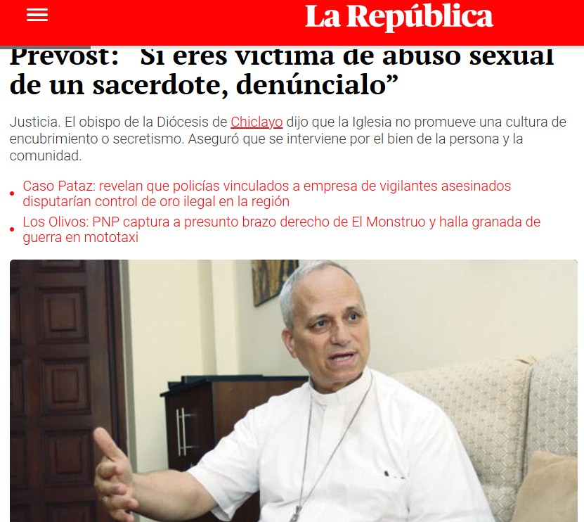 Το δημοσίευμα της περουβιανής εφημερίδας La Republica με τη συνέντευξη του νέου Πάπα το 2019 είχε τίτλο: Πρεβόστ: «Αν είσαι θύμα σεξουαλικής κακοποίησης από ιερέα, κατάγγειλέ το».