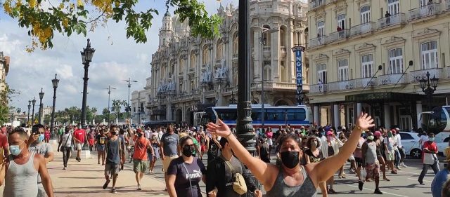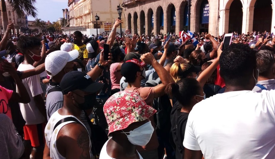 Οι διαδηλωτές εμφανίστηκαν στους δρόμους του Μορόν, πόλης στο κέντρο της Κούβας, το βράδυ της Παρασκευής. Αυτό που ξεκίνησε ως ειρηνική συγκέντρωση, σύμφωνα με τα κρατικά μέσα ενημέρωσης, κλιμακώθηκε όταν μια ομάδα ατόμων πέταξε πέτρες στα τοπικά γραφεία του Κομμουνιστικού Κόμματος, της μοναδικής κυβερνώσας πολιτικής δύναμης στη χώρα. Στη συνέχεια εισέβαλαν στο κτίριο, έβγαλαν έπιπλα έξω και τα έβαλαν φωτιά.